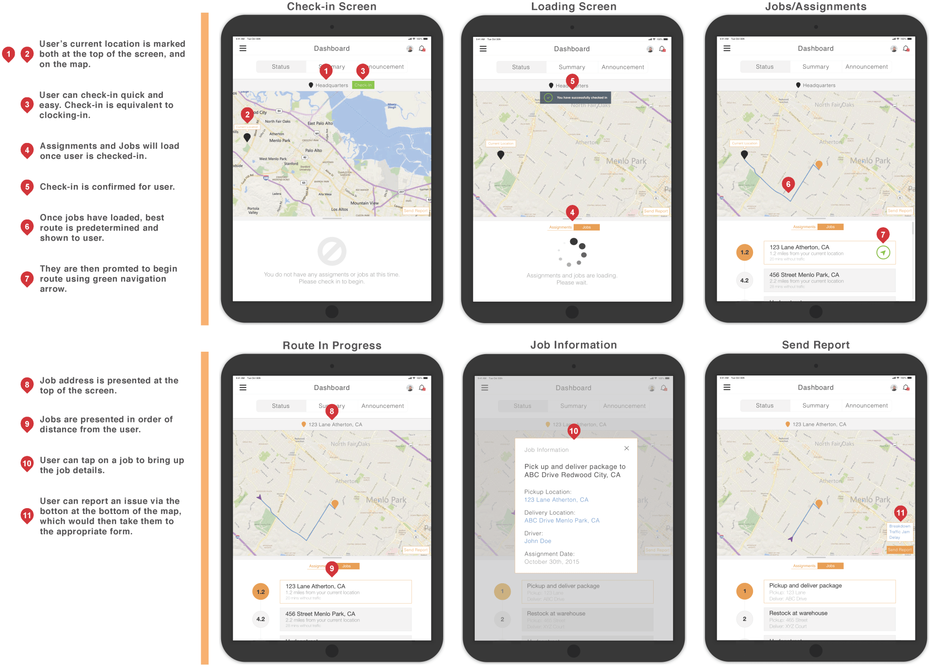 After the user/driver checks in, they are presented with jobs based on their usual route. The jobs are laid out based on distance to the drivers current location. Once the driver starts their route, navigation begins with the shortest/fastest route possible, and updates in real time based on traffic reports or delays. Reports sent in from other drivers will also be taken in and displayed.