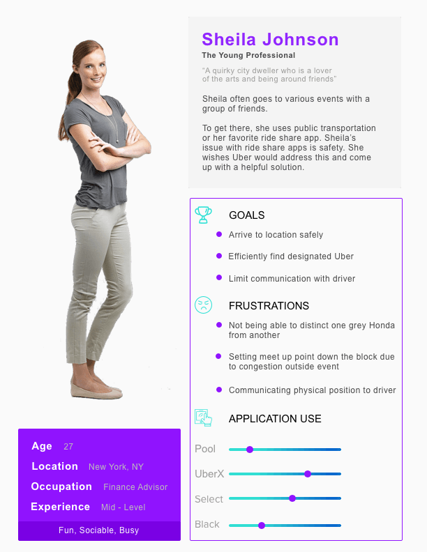 When developing the persona, we wanted to focus on individuals in densely populated areas. With our user journey, we focused on the challenge of trying to find your particular Uber ride in a sea of others.